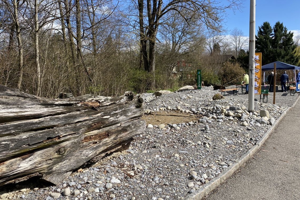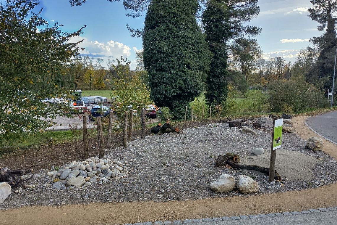 Neben der Badi in Menziken entlang eines hoch frequentierten Fusswegs wurde entsiegelt und das Areal ökologisch aufgewertet. Es sind sehr gute Voraussetzungen geschaffen worden, damit viele Tier- und Pflanzenarten die magere, durchlässige und mit Kleinstrukturen aufgewertete Fläche besiedeln können. Zur Not kann das Gelände nach wie vor als Parkplatz genutzt werden.