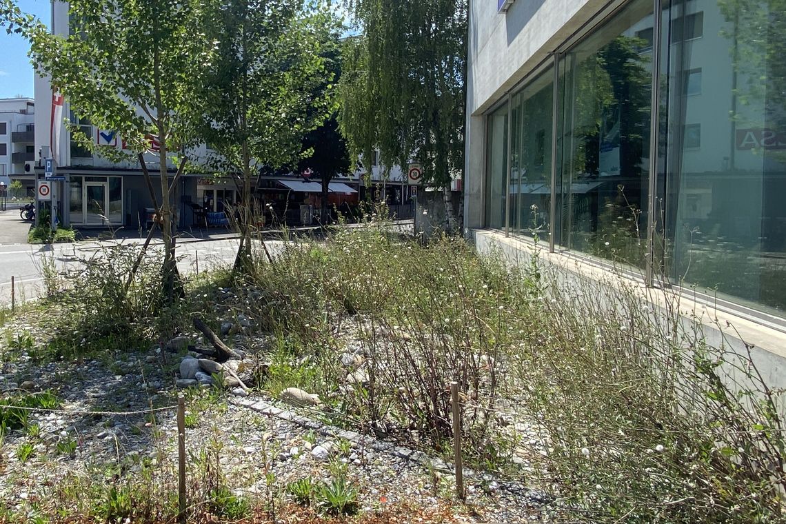 Als erste Fläche im Projekt «Asphaltknacker» wurde in der Gemeinde Suhr ein unnötig versiegelter Abschnitt entsiegelt und eine Ruderalfläche angelegt. Die Biodiversität wurde um ein Vielfaches erhöht und zwei neu gepflanzte Bäume spenden kühlenden Schatten. Das zweite Bild zeigt die Fläche im zweiten Jahr nach der Erstellung.