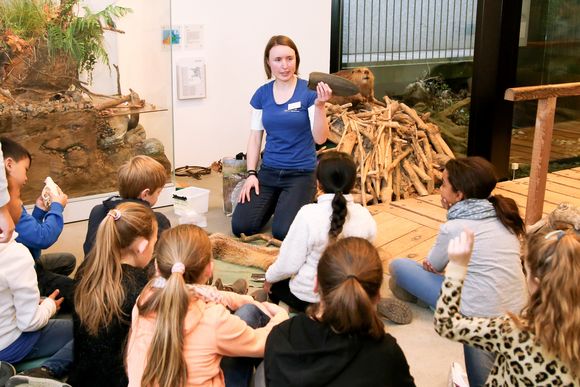 Vom wem ist diese Spur? Pfotenabdrücke und Fressspuren suchen, echte Tierpräparate ertasten und Anhänger aus Biberholz basteln.