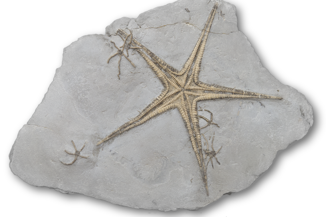 | Seestern (gross) und Schlangensterne (kleine), Pentasteria longispina Hess, 1968 und Ophiomusium gagnebini (Thurmann, 1851) | Später Jura, Untere Effinger-Schichten, Weissenstein, Schofgraben SO |