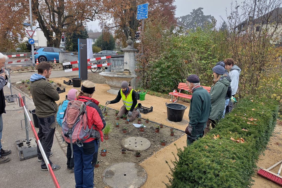 In Lenzburg wurden zwei öffentlich wirksame Flächen entsiegelt, begrünt und biodivers umgestaltet. Die IG Klima-Zukunft Lenzburg realisierte dieses Projekt mit tatkräftiger Unterstützung von über 20 Helfenden und verschiedenen Sponsoren sowie der Unterstützung durch «Asphaltknacker». Rund 60m2 wurden mit dem vorhandenen Brunnen, einer Sitzbank und einem neu gepflanzten Baum zu einem «Pocket Park» umgestaltet. Dieser bietet Platz für Pflanzen und Kleintiere und lädt zum Verweilen ein.