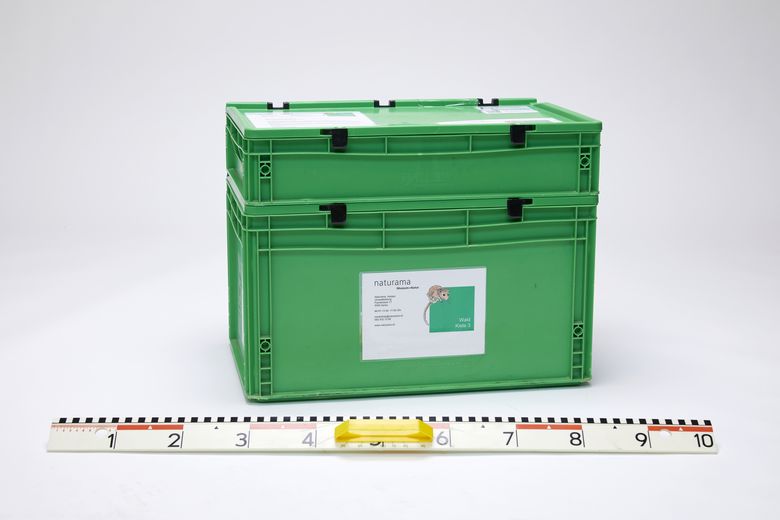 Die Lernkiste Wald besteht aus zwei Kisten, eine Kiste mit Literatur und DVDs und eine Kiste mit Unterrichtsmitteln und Aktionsmaterialien wie Stammsektoren von verschiedenen Bäumen, Duftbehälter, Trittspuren usw.