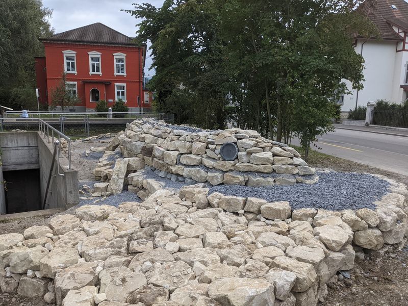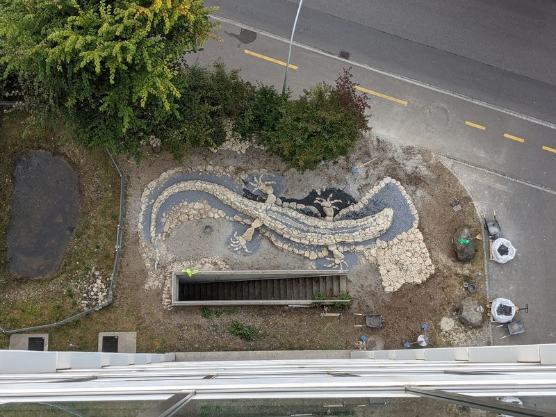 Im Park auf dem Schulgelände der Alten Kantonsschule Aarau haben zwischen Mitte und Ende September 2021 rund 180 Kantischülerinnen und -schüler eine Steinechse gebaut. Unter der Anleitung von Beat Haller, Projektleiter beim Verband der Kies- und Betonproduzenten Aargau (VKB), sowie der Künstlerin Eva Furrer errichten sie eine rund 15 Meter lange und 1,25 Meter hohe Echse aus Kalksteinen. Entlang der Aarauer Feerstrasse ist so mitten im Siedlungsgebiet ein neuer Lebensraum für Eidechsen, Insekten und Amphibien entstanden.